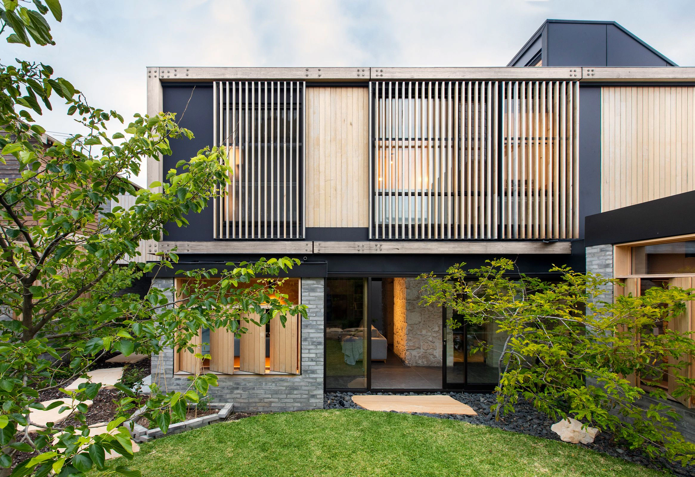 This architecturally refined house masterfully blends light, tactility, and controlled openness to create a welcoming living space. The design features a slimline Petersen brick façade paired with anodised aluminium framing, complemented by deep vertical louvres that manage the west-facing outlook and enhance air flow. A timber entry door, flanked by operable screens and framed by a striking Bruce Armstrong sculpture and delicate silver birch trees, reflects the seamless integration of nature, art, and materials. Inside, sculptural elements such as a white spiral stair with a circular skylight and carefully curated finishes evoke a serene, luminous atmosphere throughout the home.