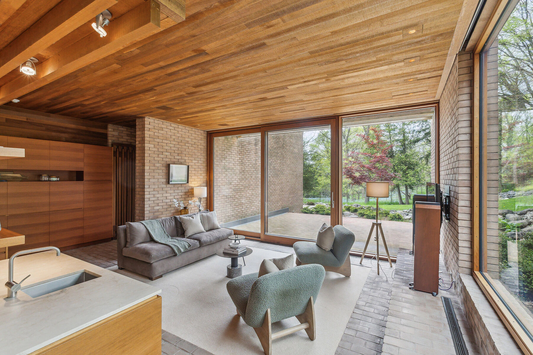 Ceilings clad in cedar, lofted on clean structural beams, stretch outwards almost effortlessly, their rhythm unbroken from inside to garden edge—a subtle gesture that confers both grandeur and shelter. The living areas, beneath these beamed expanses, provide not only a sense of volume but also an enveloping ambience. Built-in timber shelving and cabinetry hark directly to both Erickson’s and Wright’s visions, where the furnishings are not afterthoughts but essential continuations of the architecture itself.